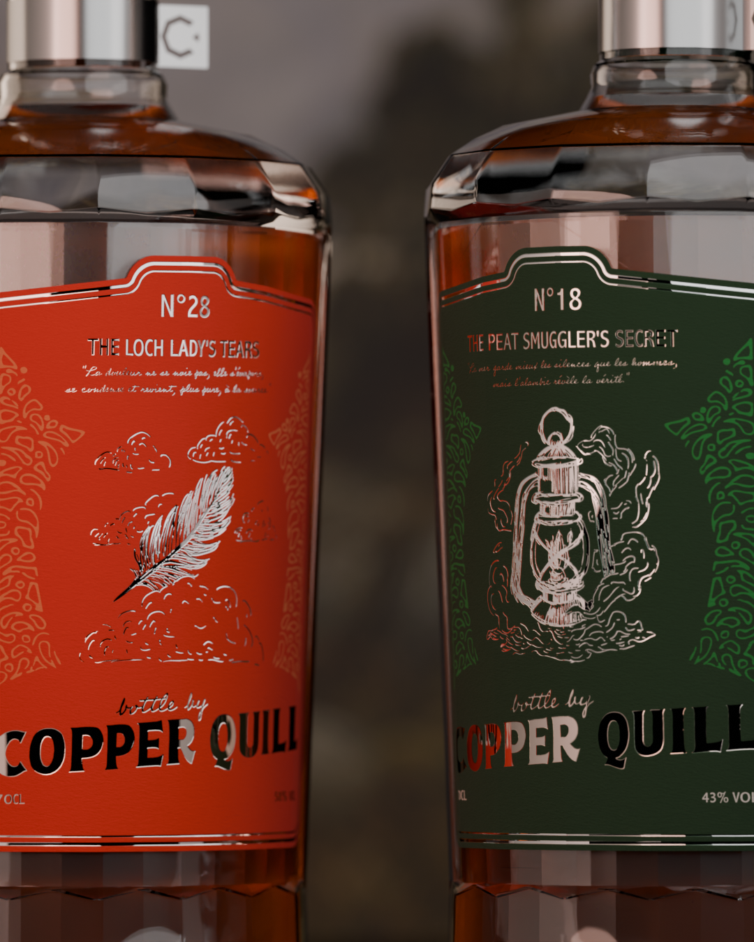 Le projet "Copper Quill" était un défi personnel d'une journée visant à créer une marque de whisky complète. L'exercice a englobé la conception de l'identité de marque, la création des étiquettes, et la modélisation 3D complète de la bouteille et de la scène sur Blender.